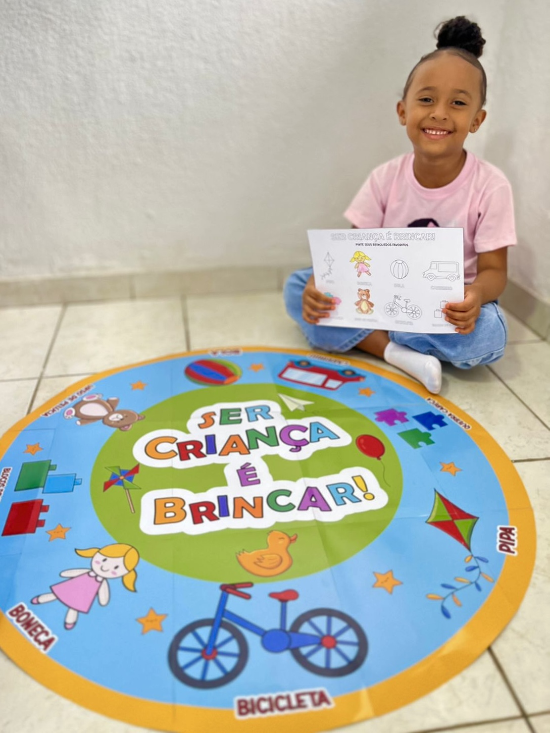 O tapete incluso + 1 folha de atividade pinte os seus brinquedos favoritos.